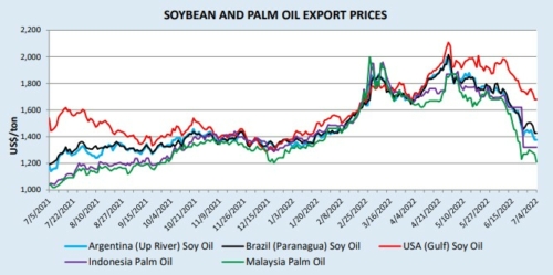 Цены на растительное масло резко упали в июне, чему способствовал слабый спрос из-за высоких цен. Увеличение экспортных поставок пальмового масла в Индонезию также способствовало падению цен на растительное масло. Цены на растительное масло в начале июля продолжили падение: пальмовое масло подешевело примерно на треть по сравнению с началом июня, а южноамериканское соевое масло