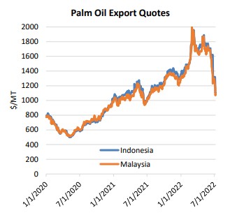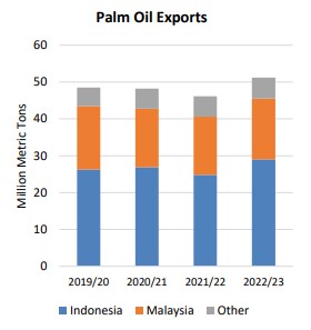 Введенный Индонезией в апреле запрет на экспорт пальмового масла усугубил эти проблемы, поскольку на его долю приходится более половины мирового экспорта. Это объявление заставило импортеров бороться за поставки, а внутренний рынок — за достаточное количество хранилищ, что привело к резкому падению внутренних цен на пальмовое масло. В ответ на это, в мае правительство Индонезии заменило запрет на экспорт обязательством для внутреннего рынка, разрешив экспорт при условии, что экспортеры сначала поставят продукцию на внутренний рынок. В июне правительство разработало программу по ускорению экспорта для сокращения запасов и еще раз стимулирования торговли. Однако увеличение обязательной доли пальмового масла в биодизельной смеси с 30% до 35% в июле может привести к сокращению объема, доступного для экспорта.