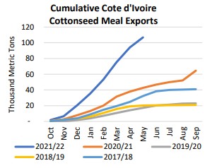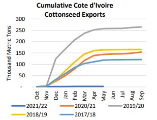 выращивая в среднем 273 000 тонн в год. В обычный год большая часть продукции экспортируется в соседние страны, включая Мали и Буркина-Фасо, и только около четверти или трети урожая измельчается внутри страны. Тем не менее, за первые 8 месяцев 2021/22 года Кот-д’Ивуар экспортировал менее 3000 тонн, что значительно ниже среднего за предыдущие 3 года общего объема экспорта за май, который составлял чуть менее 190 000 тонн. И наоборот, производство хлопковых семян выросло более чем на 250 процентов в годовом исчислении. Аналогичным образом, увеличение производства хлопкового шрота привело к увеличению экспорта. В то время как экспорт хлопкового шрота по-прежнему идет в Мали и Буркина-Фасо, большая его часть поставляется в Сенегал и Мавританию. Экспорт хлопкового масла из Кот-д’Ивуара также вырос, но на его долю приходится небольшой процент производства. Вместо этого хлопковое масло, вероятно, используется в пищу, чтобы компенсировать высокие цены на растительное масло и сокращение потребления пальмового масла из-за рекордных темпов экспорта.