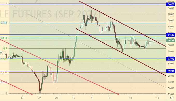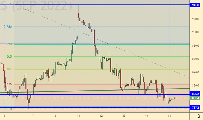 Несмотря на то, что переговоры о поставках украинского зерна идут кукуруза не торопится падать. Текущая формация может прорасти к 630.0, возможно к 720.0. Если же падение продолжится с текущих уровней, то внизу нас ждет 550.0.