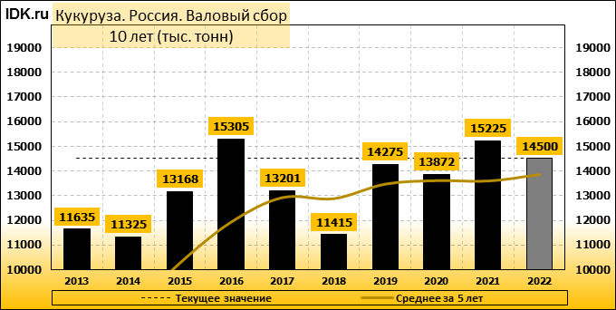 Валовый сбор: оценка пересмотрена в сторону понижения до 14500 тысяч тонн. Показатель упал на -6.45 процента.