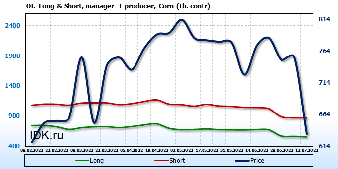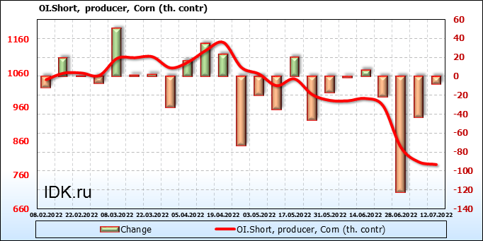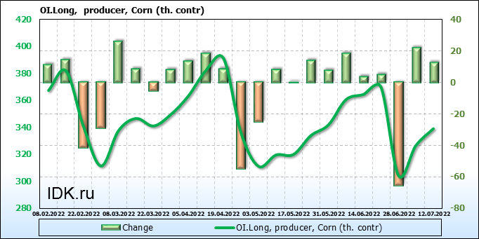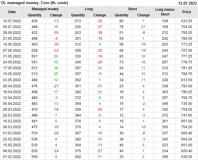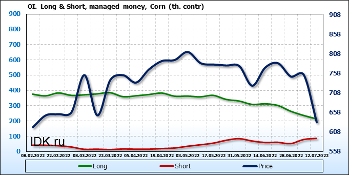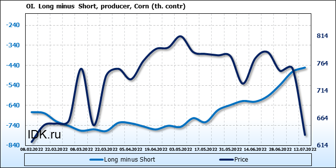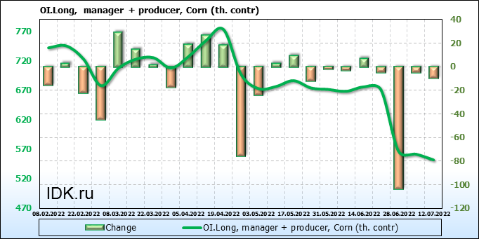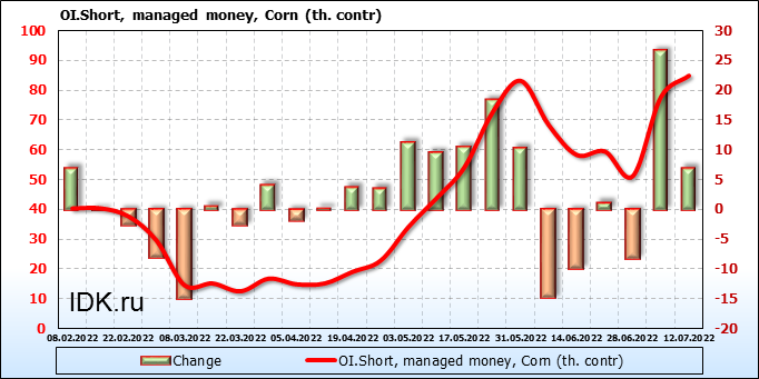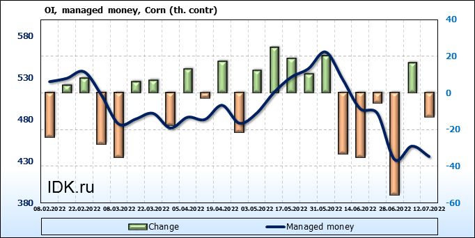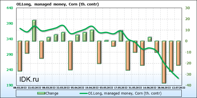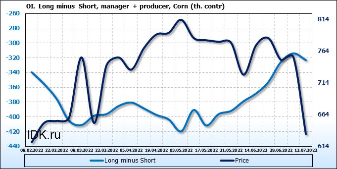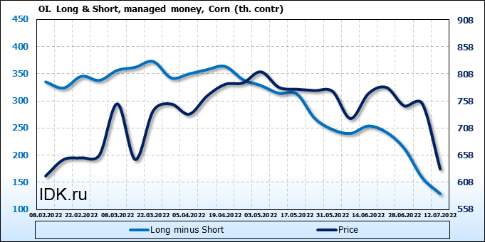 За прошлую неделю, 06.07.22 — 12.07.22, разница между длинными и короткими позициями управляющих сократилась на 29.5 тыс. контрактов. В тоже время, цена упала на 121.25 цента.