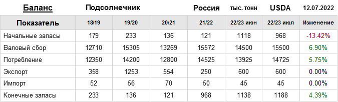 За прошедший месяц министерство сельского хозяйства США (USDA) на 12.07.2022 пересмотрело Баланс подсолнечника для России в сезоне 22/23 следующим образом: