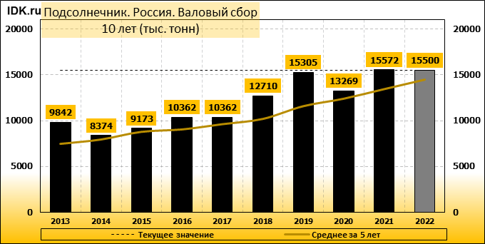 Валовый сбор: оценка пересмотрена в сторону повышения до 15500 тысяч тонн. Показатель вырос на 6.9 процента.