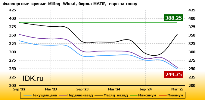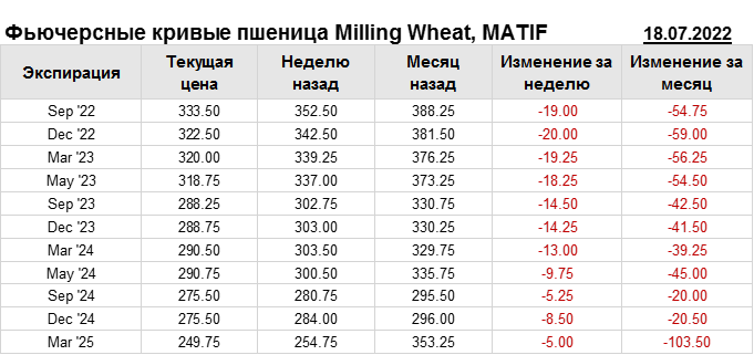 На 18.07.2022 стоимость пшеницы Milling Wheat на бирже MATIF по контракту Sep ’22 составила 333.5 евро за тонну. За прошедшую неделю стоимость пшеницы Milling Wheat упала на 19 евро/тонна. Как мы видим на графике, фьючерсная кривая имеет периоды, когда более дальний фьючерс дешевле ближнего. Состояние бэквардации наблюдаем на следующих контрактах: Dec ’22; Mar ’23; May ’23; Sep ’23; Sep ’24; Mar ’25. Таким образом, трейдеры предполагают, что возможно превалирование предложения над спросом в указанные периоды.