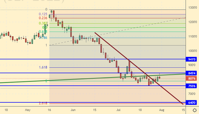 Сценарий роста: рассматриваем сентябрьский фьючерс, дата экспирации 14 сентября. Продолжаем отказываться от покупок. Ждем рынок на уровне 650.0 центов за бушель. Там будем входить в лонг.