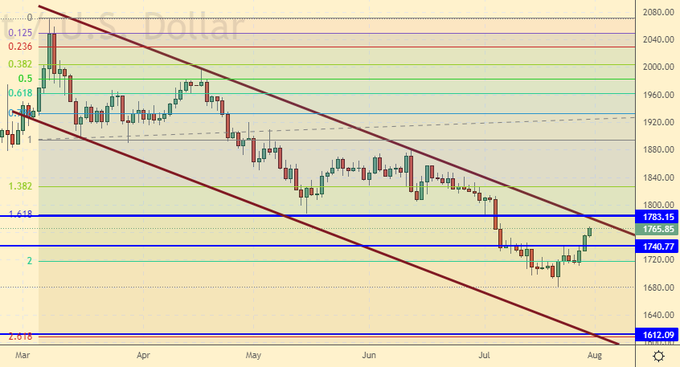 Покупка: нет. Кто в позиции от 1695 и 1700, перенесите стоп на 1720. Цель: 1780 (2300!).