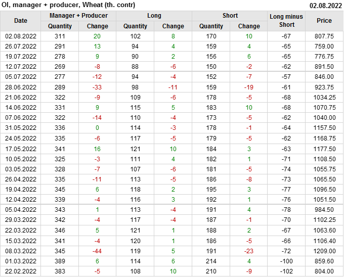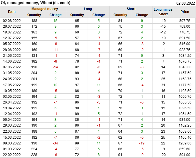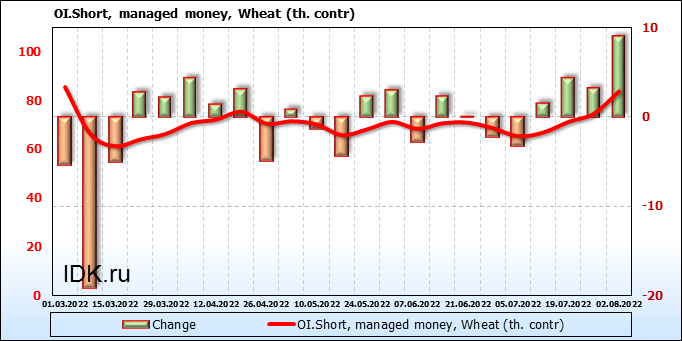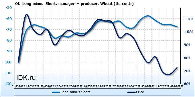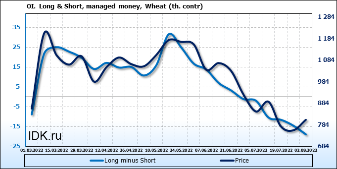 За прошедшую неделю, 27.07.22 — 02.08.22, разница между длинными и короткими позициями управляющих увеличилась на 4.4 тыс. контрактов. В тоже время, цена выросла на 48.75 цента.