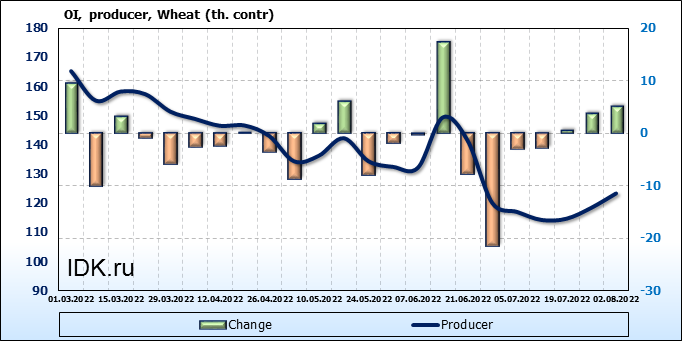 Открытый интерес производителей вырос на 5 тыс. контрактов. Объем контрактов, направленных на хеджирование, составляет 123 296 штук. Деньги производителей в течение прошлой недели приходили на рынок поддерживая тенденцию.