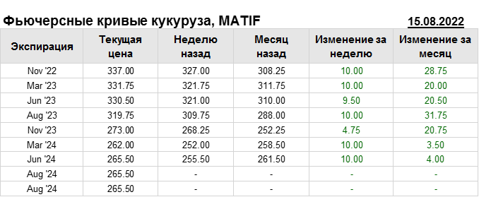 На 15.08.2022 стоимость кукурузы на бирже MATIF по контракту Nov ’22 составила 337 евро за тонну. За прошедшую неделю стоимость кукурузы на европейской площадке выросла на 10 евро/тонна. Как мы видим на графике, фьючерсная кривая имеет периоды, когда более дальний фьючерс дешевле ближнего. Состояние бэквардации наблюдаем на следующих контрактах: Mar ’23; Jun ’23; Aug ’23; Nov ’23; Mar ’24. Таким образом, трейдеры предполагают, что возможно превалирование предложения над спросом в указанные периоды.