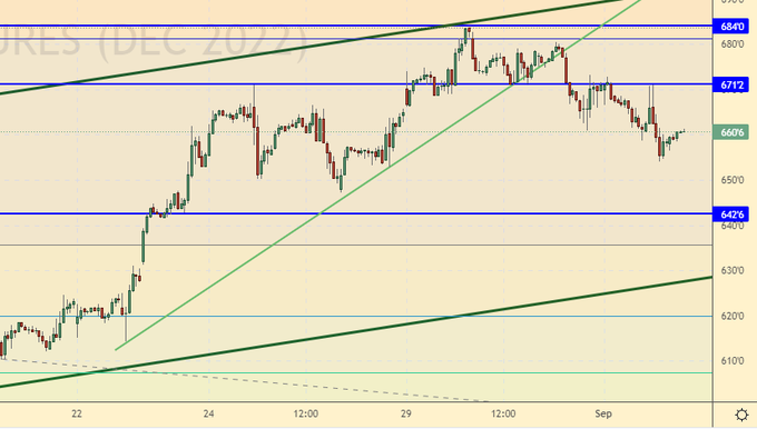 Продавцы не могут пробиться к уровню 600.0. Пока на рынке равновесие. До выхода отчета USDA остается 7 торговых дней. Возможно, что небольшое движение вниз мы все-таки увидим. Отметим, что падение ниже 600.0 может привести к ходу на 550.0.