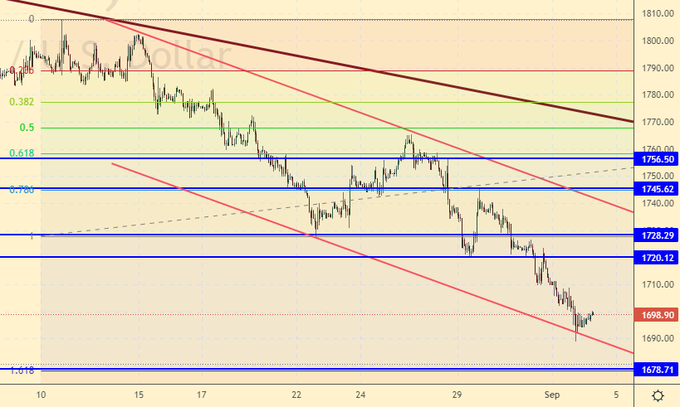 На фоне сильного доллара мы почти достигли промежуточной цели на 1680. Скорее всего эта отметка будет достигнута, после чего нас ждет небольшая пауза, а далее рынок продолжит падение к 1600.