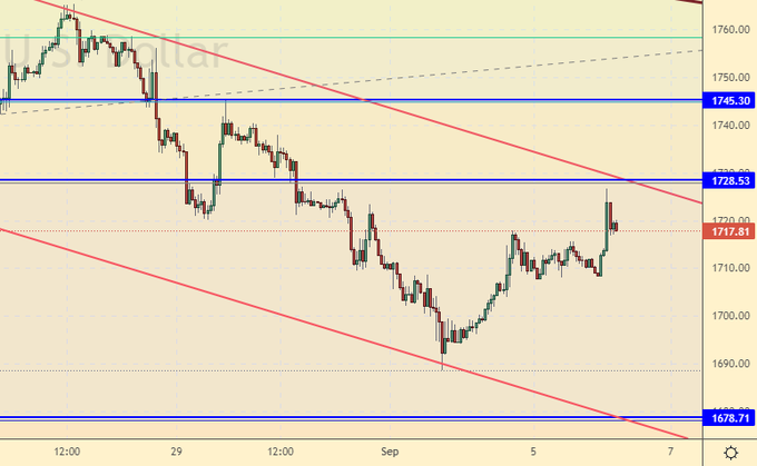 Рынок дал возможность продать при подходе к 1730. Перспектив для продолжения роста у золота крайне мало, так как доллар продолжает доминировать. Спрос на него продолжит расти в ближайшие месяцы так как всем нужны будут облигации США.