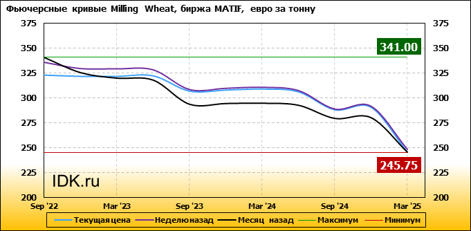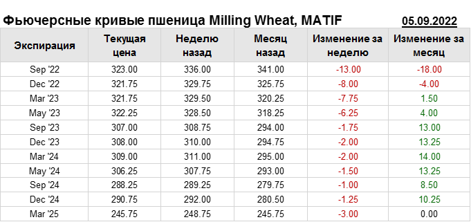 На 05.09.2022 стоимость пшеницы Milling Wheat на бирже MATIF по контракту Sep ’22 составила 323 евро за тонну. За прошедшую неделю стоимость пшеницы Milling Wheat упала на 13 евро/тонна. Как мы видим на графике, фьючерсная кривая имеет периоды, когда более дальний фьючерс дешевле ближнего. Состояние бэквардации наблюдаем на следующих контрактах: Dec ’22; Sep ’23; May ’24; Sep ’24; Mar ’25. Таким образом, трейдеры предполагают, что возможно превалирование предложения над спросом в указанные периоды.