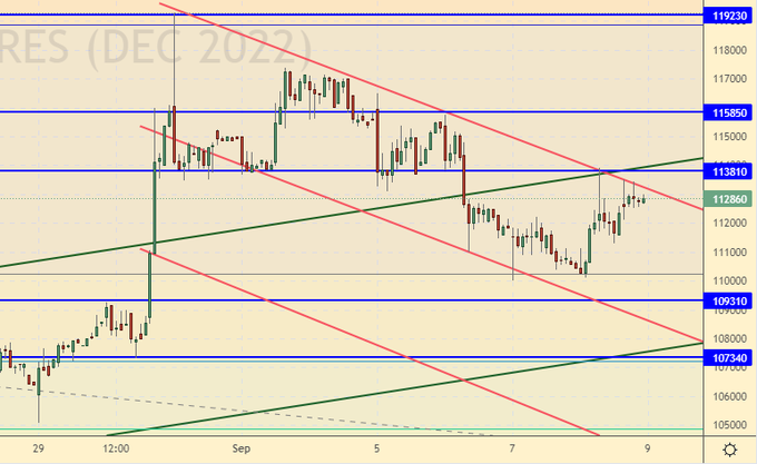 Хорошие уровни для входа в шорт. Видим, что выше 114000 пройти мы не можем, что создает хорошую ситуацию именно для продавцов, тем более что мы продолжаем находиться в границах падающего канала.