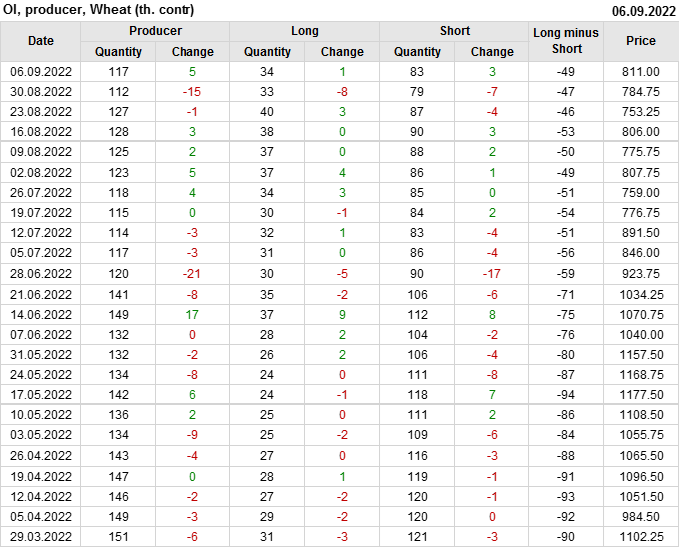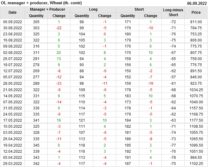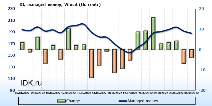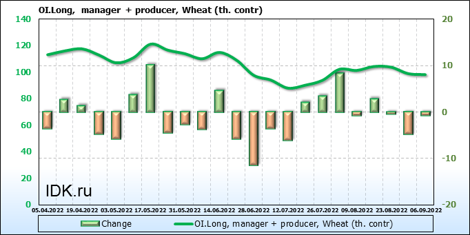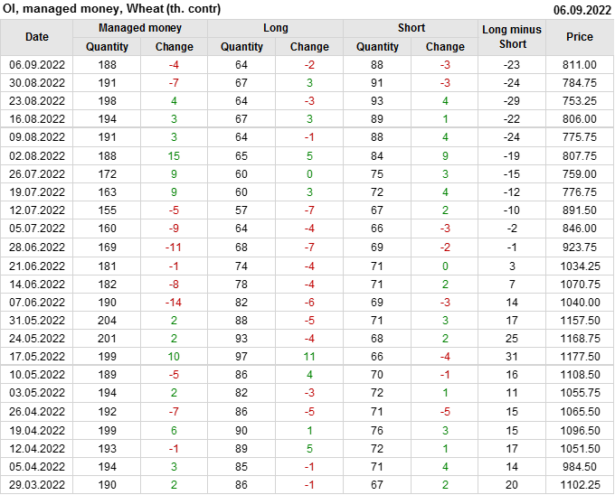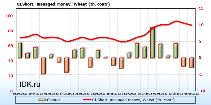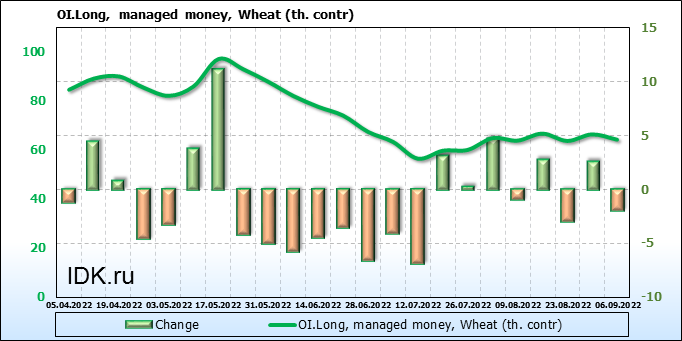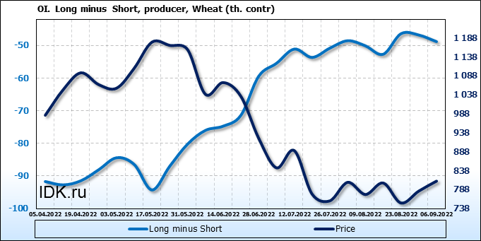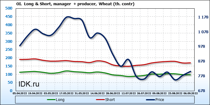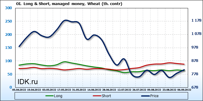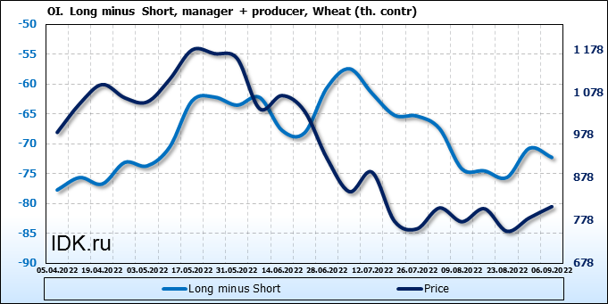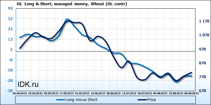 За прошедшую неделю, 31.08.22 — 06.09.22, разница между длинными и короткими позициями управляющих сократилась на 0.5 тыс. контрактов. В тоже время, цена выросла на 26.25 цента.