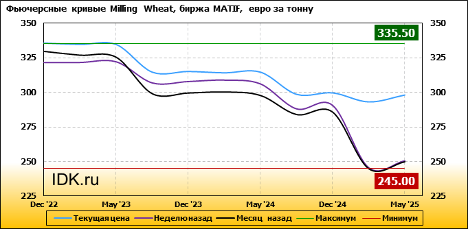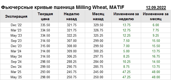 На 12.09.2022 стоимость пшеницы Milling Wheat на бирже MATIF по контракту Dec ’22 составила 335.5 евро за тонну. За прошедшую неделю стоимость пшеницы Milling Wheat выросла на 13.75 евро/тонна. Как мы видим на графике, фьючерсная кривая имеет периоды, когда более дальний фьючерс дешевле ближнего. Состояние бэквардации наблюдаем на следующих контрактах: Mar ’23; Sep ’23; Mar ’24; Sep ’24; Mar ’25. Таким образом, трейдеры предполагают, что возможно превалирование предложения над спросом в указанные периоды.