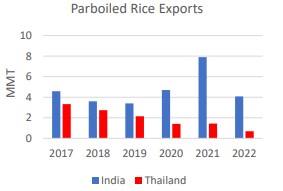 Поскольку рис-сырец может быть переработан в обычный белый рис или пропаренный рис, новая политика может способствовать увеличению поставок пропаренного риса, поскольку он не будет облагаться налогом. Однако за последние несколько лет Индия увеличила долю мирового экспорта пропаренных продуктов, отгрузив 4,1 млн тонн за первые 7 месяцев 2022 года по сравнению с 0,7 млн тонн из Таиланда за тот же период.