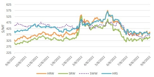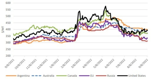После августовского отчета WASDE котировки в США были разнонаправленными по сравнению с предыдущим месяцем, отражая комбинацию давления на урожай яровой пшеницы и растущей обеспокоенности по поводу неопределенности относительно продолжения украинского зернового коридора. Hard Red Spring (HRS) подешевел на 15 долларов по сравнению с прошлым месяцем до 382 долларов за тонну, поскольку сбор урожая достиг 71 процента (по сравнению с 94 процентами год назад), что отражает поздний посев в Северной Дакоте. Hard Red Winter подорожала на 5 долларов за тонну до 392 долларов, когда сбор урожая подошёл к концу, но в будущем есть опасения относительно сохраняющихся засушливых условий в Южных Высоких равнинах, когда начинается посев озимой пшеницы. Спрос на Soft White Winter (SWW) повысился на 13 долларов за тонну до 375 долларов. Soft Red Winter (SRW) подорожала на 7 долларов за тонну до 351 доллара на фоне растущего международного спроса.