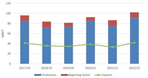 Пока что в 2022/23 году экспорт начал увеличиваться. Тем не менее, продолжающиеся проблемы с бронированием продаж и экспортной логистикой, а также продолжающееся введение государством экспортной пошлины привели к более скромному началу экспортной кампании.