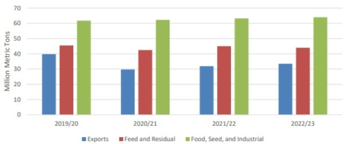 Пшеница в ЕС в основном используется для производства продуктов питания, объем которой растет по мере ослабления ограничений, связанных с COVID, и восстановления туризма. Кроме того, приток беженцев из Украины повысил потребительский спрос. После продуктов питания следующий по величине объем пшеницы предназначен для использования в качестве корма для животных, который остается стабильным.