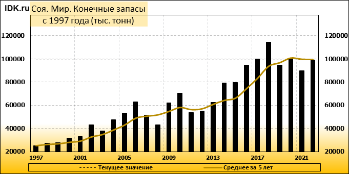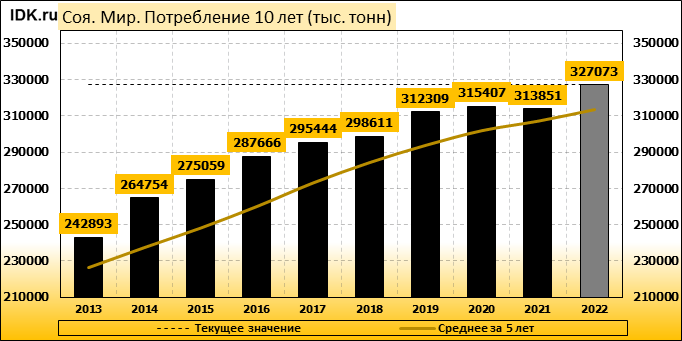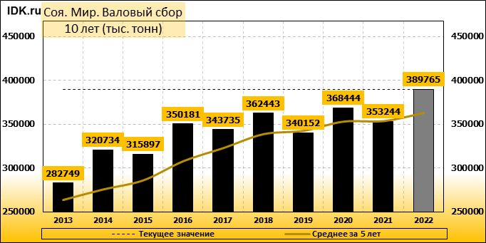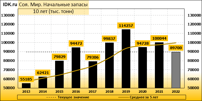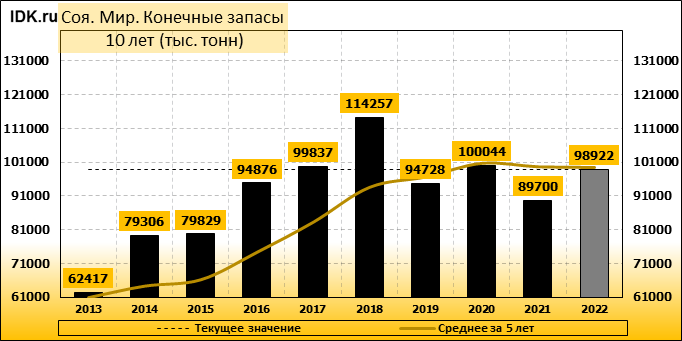 Министерство сельского хозяйства США сообщает, что фермеры соберут 4,38 баррелей сои в 2022 году при средней урожайности по стране 50,5 баррелей в год. Это на 153 миллиона баррелей меньше прогноза прошлого месяца и отражает сокращение урожайности на 1,4 бпа/год и пересмотр посевных площадей на полмиллиона акров. Оба находятся на нижней границе предварительных ожиданий. USDA прогнозирует запасы старого урожая на конец 2021–2022 года на уровне 240 млн баррелей, что отражает более низкий экспортный прогноз.