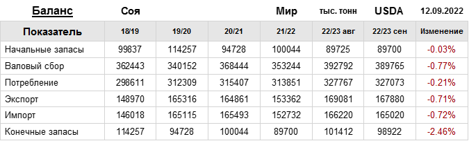 За прошедший месяц министерство сельского хозяйства США (USDA) на 12.09.2022 пересмотрело Баланс сои для Мира в сезоне 22/23 следующим образом: