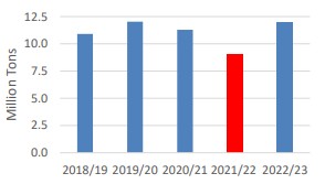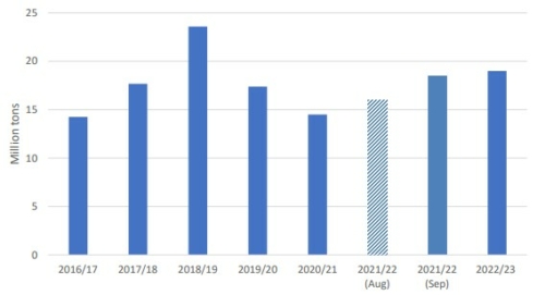 С 2018/19 по 2020/21 год Вьетнам ежегодно импортировал более 10 миллионов тонн кукурузы, в основном для удовлетворения растущего внутреннего спроса на корма для свиней, птицы и аквакультуры. Однако при нынешних сниженных ежемесячных объемах Вьетнам, как ожидается, импортирует всего 9,5 млн тонн кукурузы в 2021/22 году — самый низкий показатель с 2017/18 года. Большая часть этого изменения связана с относительно низким импортом в июле 2022 года. Вьетнамская таможня сообщила об импорте всего 593 000 тонн кукурузы, что составляет менее половины объема, импортированного за тот же месяц в 2021 году.