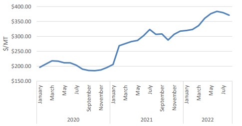 После августовского WASDE ставки основных экспортеров выросли. Заявки США выросли на 26 долларов за тонну до 325 долларов. В августе Министерство сельского хозяйства США сократило среднюю урожайность по стране на 1,6 бушеля с акра, что привело к снижению производства и небольшому сокращению экспорта из США. Заявки Бразилии выросли всего на 4 доллара за тонну до 294 долларов.