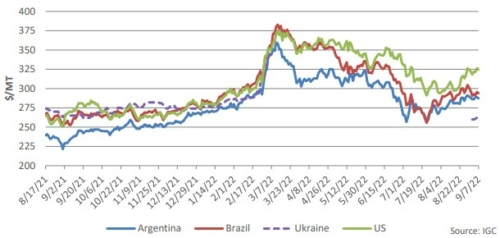 Экспорт кукурузы из Бразилии в августе достиг рекордного уровня в 7,6 млн тонн, что отражает высокий уровень производства и высокий мировой спрос. Заявки Аргентины выросли на 13 долларов за тонну до 287 долларов. Украинские заявки были опубликованы впервые с марта и составили $261/т. Относительный дисконт по отношению к другим экспортерам, вероятно, отражает повышенный риск и сохраняющуюся неопределенность в отношении Черноморского зернового коридора.
