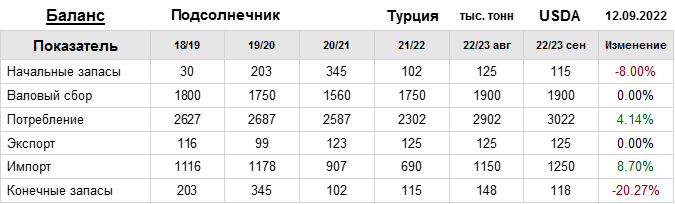 За прошедший месяц министерство сельского хозяйства США (USDA) на 12.09.2022 пересмотрело Баланс подсолнечника для Турции в сезоне 22/23 следующим образом: