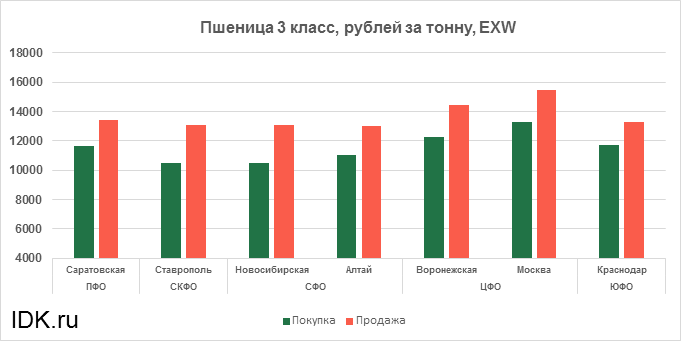 За прошедшую неделю с 19.09.2022 по 23.09.2022 средняя цена на пшеницу 3-го класса, согласно выставленным заявкам трейдеров, выросла по всем округам на 208 рублей. Средняя цена составляет 12470 рублей за тонну.