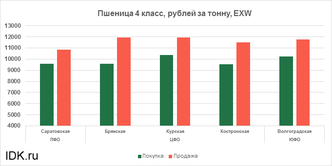 За прошедшую неделю с 19.09.2022 по 23.09.2022 средняя цена на пшеницу 4-го класса, согласно выставленным заявкам трейдеров, выросла по всем округам на 135 рублей. Средняя цена составляет 10671 рубль за тонну.