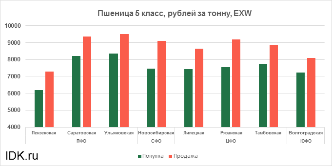 За прошедшую неделю с 19.09.2022 по 23.09.2022 средняя цена на пшеницу 5-го класса, согласно выставленным заявкам трейдеров, упала по всем округам на 1480 рублей. Средняя цена составляет 7991 рубль за тонну.