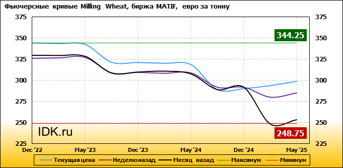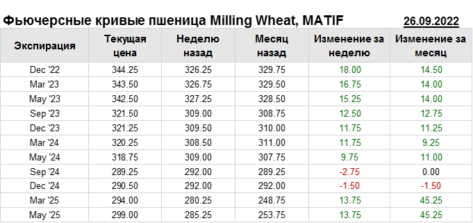 На 26.09.2022 стоимость пшеницы Milling Wheat на бирже MATIF по контракту Dec ’22 составила 344.25 евро за тонну. За прошедшую неделю стоимость пшеницы Milling Wheat выросла на 18 евро/тонна. Как мы видим на графике, фьючерсная кривая имеет периоды, когда более дальний фьючерс дешевле ближнего. Состояние бэквардации наблюдаем на следующих контрактах: Mar ’23; May ’23; Sep ’23; Dec ’23; Mar ’24; May ’24; Sep ’24. Таким образом, трейдеры предполагают, что возможно превалирование предложения над спросом в указанные периоды.