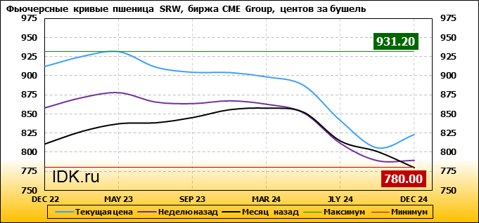 На 03.10.2022 стоимость пшеницы SRW на бирже CME Group по контракту DEC 22 составила 912 центов за бушель. За прошедшую неделю стоимость пшеницы SRW выросла на 54 цента/бушель. Как мы видим на графике, фьючерсная кривая имеет периоды, когда более дальний фьючерс дешевле ближнего. Состояние бэквардации наблюдаем на следующих контрактах: JLY 23; SEP 23; DEC 23; MAR 24; MAY 24; JLY 24; SEP 24. Таким образом, трейдеры предполагают, что возможно превалирование предложения над спросом в указанные периоды.