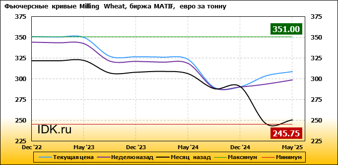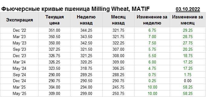 На 03.10.2022 стоимость пшеницы Milling Wheat на бирже MATIF по контракту Dec ’22 составила 351 евро за тонну. За прошедшую неделю стоимость пшеницы Milling Wheat выросла на 6.75 евро/тонна. Как мы видим на графике, фьючерсная кривая имеет периоды, когда более дальний фьючерс дешевле ближнего. Состояние бэквардации наблюдаем на следующих контрактах: Mar ’23; May ’23; Sep ’23; Dec ’23; Mar ’24; May ’24; Sep ’24. Таким образом, трейдеры предполагают, что возможно превалирование предложения над спросом в указанные периоды.