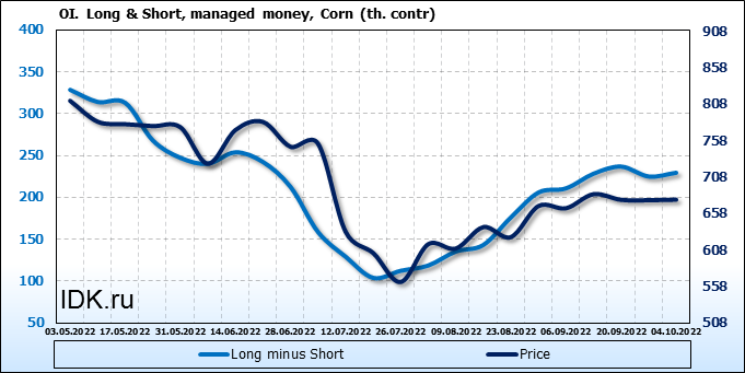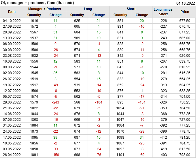 За прошлую неделю, 28.09.22 — 04.10.22, разница между длинными и короткими позициями управляющих увеличилась на 4.5 тыс. контрактов. В тоже время, цена выросла на 0.75 цента.