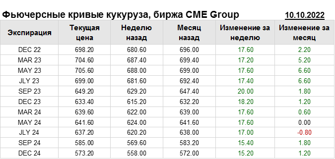 На 10.10.2022 стоимость кукурузы на бирже CME Group по контракту DEC 22 составила 698.2 цента за бушель. За прошедшую неделю стоимость кукурузы на площадке CME Group выросла на 17.6 цента/бушель. Как мы видим на графике, фьючерсная кривая имеет периоды, когда более дальний фьючерс дешевле ближнего. Состояние бэквардации наблюдаем на следующих контрактах: JLY 23; SEP 23; DEC 23; JLY 24; SEP 24; DEC 24. Таким образом, трейдеры предполагают, что возможно превалирование предложения над спросом в указанные периоды.