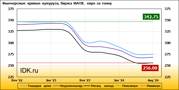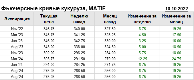 На 10.10.2022 стоимость кукурузы на бирже MATIF по контракту Nov ’22 составила 346.75 евро за тонну. За прошедшую неделю стоимость кукурузы на европейской площадке выросла на 6.75 евро/тонна. Как мы видим на графике, фьючерсная кривая имеет периоды, когда более дальний фьючерс дешевле ближнего. Состояние бэквардации наблюдаем на следующих контрактах: Mar ’23; Aug ’23; Nov ’23; Jun ’24; Aug ’24. Таким образом, трейдеры предполагают, что возможно превалирование предложения над спросом в указанные периоды.