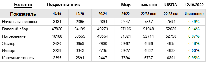 За прошедший месяц министерство сельского хозяйства США (USDA) на 12.10.2022 пересмотрело Баланс подсолнечника для Мира в сезоне 22/23 следующим образом: