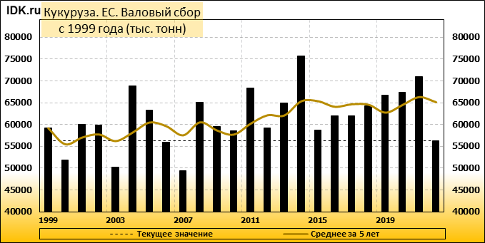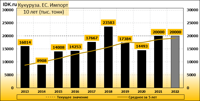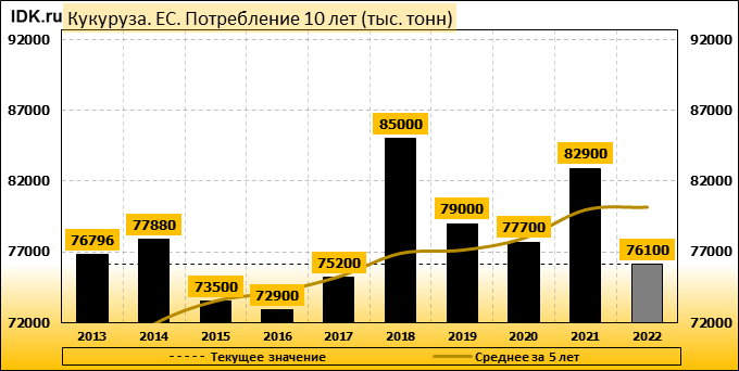 В условиях изнуряющей засухи в Европейском Союзе ожидается самый низкий урожай кукурузы с 2007/08 года, при этом прогноз производства снизится на 21 процент по сравнению с прошлым годом. В результате импорт достиг значительных объемов в последние недели 2021/22 года, и, по прогнозам, Европейский Союз снова станет крупнейшим в мире импортером кукурузы в 2022/23 году, поскольку Китай сокращает свой импорт. Поскольку спрос ЕС на импортируемую кукурузу вырос из-за плохого урожая, он увеличил свой импорт не только из Бразилии, но и из Украины через Черноморский зерновой коридор, где сохраняется неопределенность в отношении его продолжения. Европейский Союз также обычно является нетривиальным экспортером кукурузы. Поскольку в Румынии, крупнейшем государстве-экспортере, наблюдается значительное снижение производства, прогнозируется, что общий экспорт кукурузы из ЕС резко сократится с 2021/22 года.