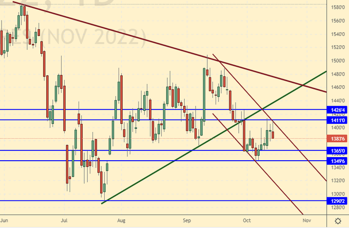 Сценарий роста: рассматриваем декабрьский фьючерс, дата экспирации 15 декабря. На фоне восьмого пакета санкций от Евросоюза индекс стоит в диапазоне. С приближением зимы Запад теряет интерес к тому, что происходит на Украине, предпочитая несколько дистанцироваться от конфликта. Пусть это происходит и не по всем направлениям, но есть ощущение, что ситуацию будут пытаться как-то спустить на тормозах. Если появятся намеки на заключение соглашения с Киевом, то рынок метнется вверх. Однако, на данный день и час позитивных новостей у нас нет.
