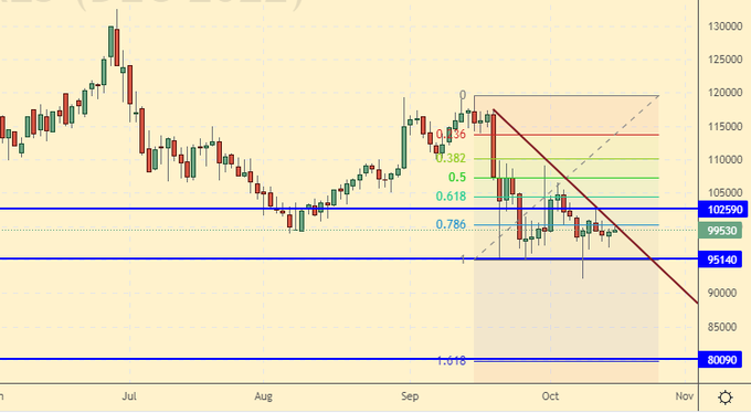 Сценарий падения: если мы поднимемся выше уровня 105000, то возможно, что нам придется пересмотреть свои медвежьи взгляды на текущую ситуацию. А пока этого не произошло, будем продолжать держать шорт от 118000. Цели на 80000 и на 50000 пунктов остаются.