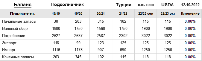 За прошедший месяц министерство сельского хозяйства США (USDA) на 12.10.2022 пересмотрело Баланс подсолнечника для Турции в сезоне 22/23 следующим образом: