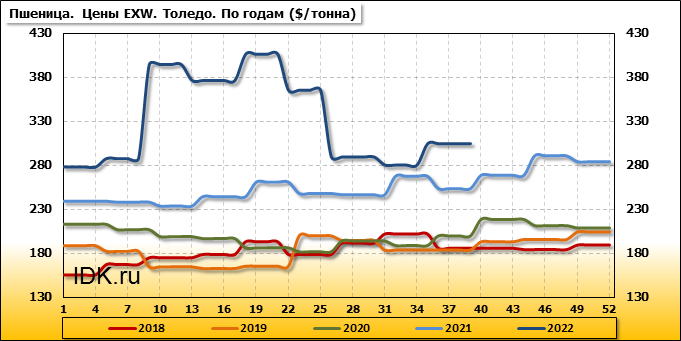 Внутренние цены на пшеницу SRW в городе Толедо (США) выросли на 24.3 $/т. и на отчетный месяц составляют 305.07 доллара за тонну.