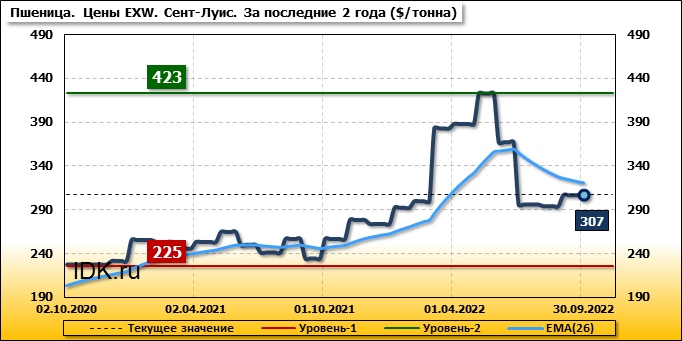 За прошедший месяц внутренние цены на пшеницу SRW в Сент-Луисе (США) выросли на 12.5 $/т. и на отчетный месяц составляют 306.91 доллара за тонну.