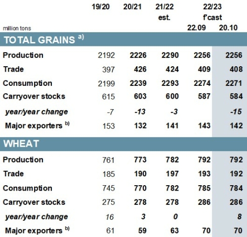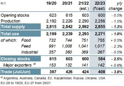 Прогноз мирового производства зерновых (пшеница и фуражное зерно) в 2022/23 г. сохраняется на уровне 2 256 млн т, поскольку сокращение производства кукурузы в месячном исчислении уравновешивается улучшенной оценкой ячменя. Мировое потребление снижено на 3 млн т в месячном исчислении, включая сокращение на корма, продукты питания и промышленное использование.
