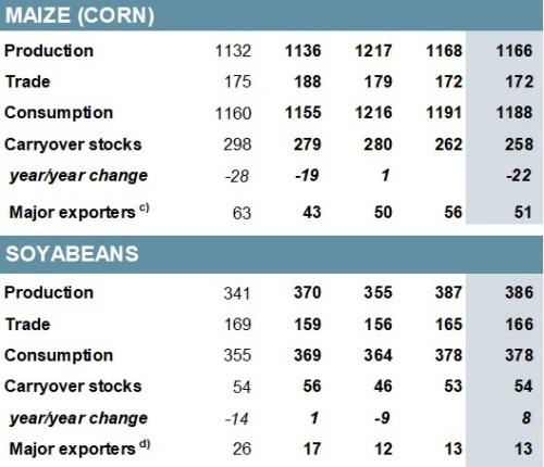 Принимая во внимание меньшие, чем предполагалось ранее, начальные запасы, показатель мировых переходящих запасов (совокупность соответствующих местных маркетинговых лет) на 3 миллиона тонн ниже, чем ранее, и составляет 584 миллиона. Перспективы торговли (июль/июнь) несколько снижены до 408 млн т из-за сокращения объемов импорта кукурузы (в основном в Азию), пшеницы (включая Египет и Китай) и сорго (Китай).