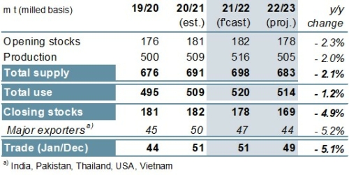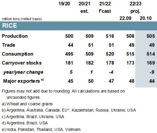 Поскольку у ключевых азиатских производителей ожидается более низкий урожай, мировое производство риса в 2022/23 году, по прогнозам, упадет на 2% в годовом исчислении до 505 млн тонн. Включая сокращение в Индии и Китае, мировое потребление немного сократится по сравнению с прошлым годом, в то время как запасы будут сокращаться, включая меньшие поставки у экспортеров из Южной Азии. Прогнозируется, что после общего максимума в предыдущем году торговля сократится на 5% в 2023 году, поскольку более низкий спрос со стороны азиатских покупателей перевешивает потенциальный рост покупательского интереса со стороны африканских импортеров.